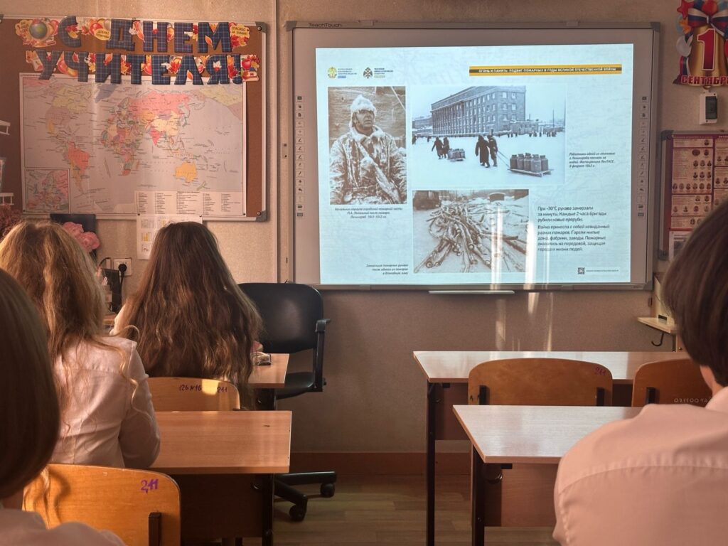 Целью урока стало знакомство школьников с героическими буднями пожарных, которые, наравне с солдатами на фронте, самоотверженно защищали тыл от огня в годы Великой Отечественной войны. Используя материалы мультимедийной выставки, Алиса Игоревна рассказала о том, как пожарные боролись с огнем в осажденном Ленинграде, как тушили пожары после бомбардировок, как спасали людей из горящих зданий.